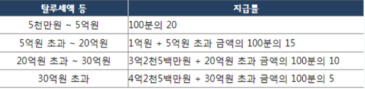 아래 표는 탈세 제보 포상금 지급률을 확인할 수 있습니다.