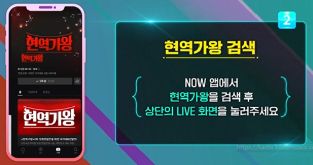 NOW 앱에 접속하여 검색창에 현역가왕을 검색합니다. 현역가왕 화면에서 상단의 LIVE 화면을 눌러줍니다.