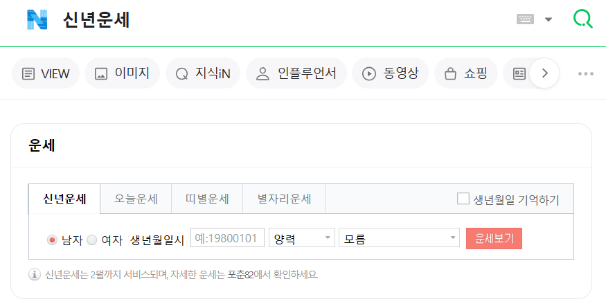 네이버 검색창에 신년운세를 검색하시면 신년운세 뿐만 아니라 오늘운세, 띠별운세, 별자리운세도 무료로 간편하게 알아 볼 수 있습니다. 신년운세는 2월까지 서비스된다고 하니 참고하시길 바랍니다.