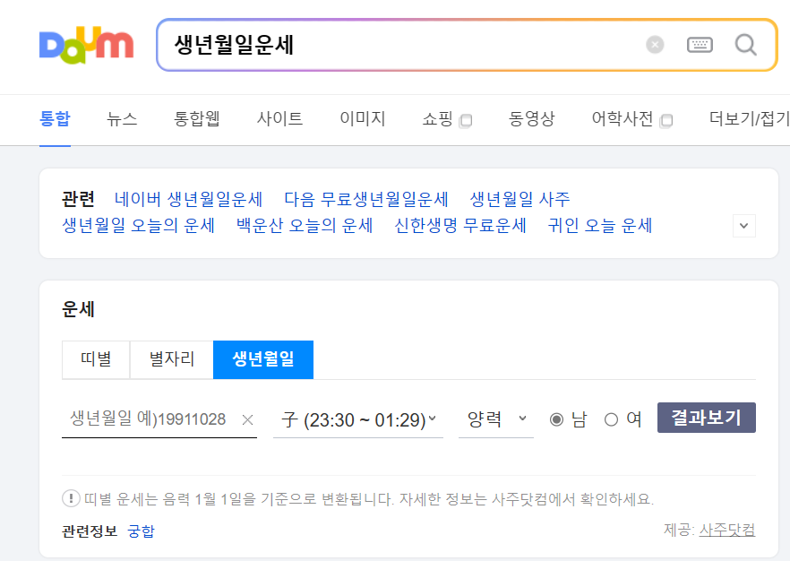 다음 검색창에 운세를 검색하시고 스크롤을 내리면 운세에서 띠별, 별자리, 생년월일별 운세를 쉽게 알 수 있습니다.