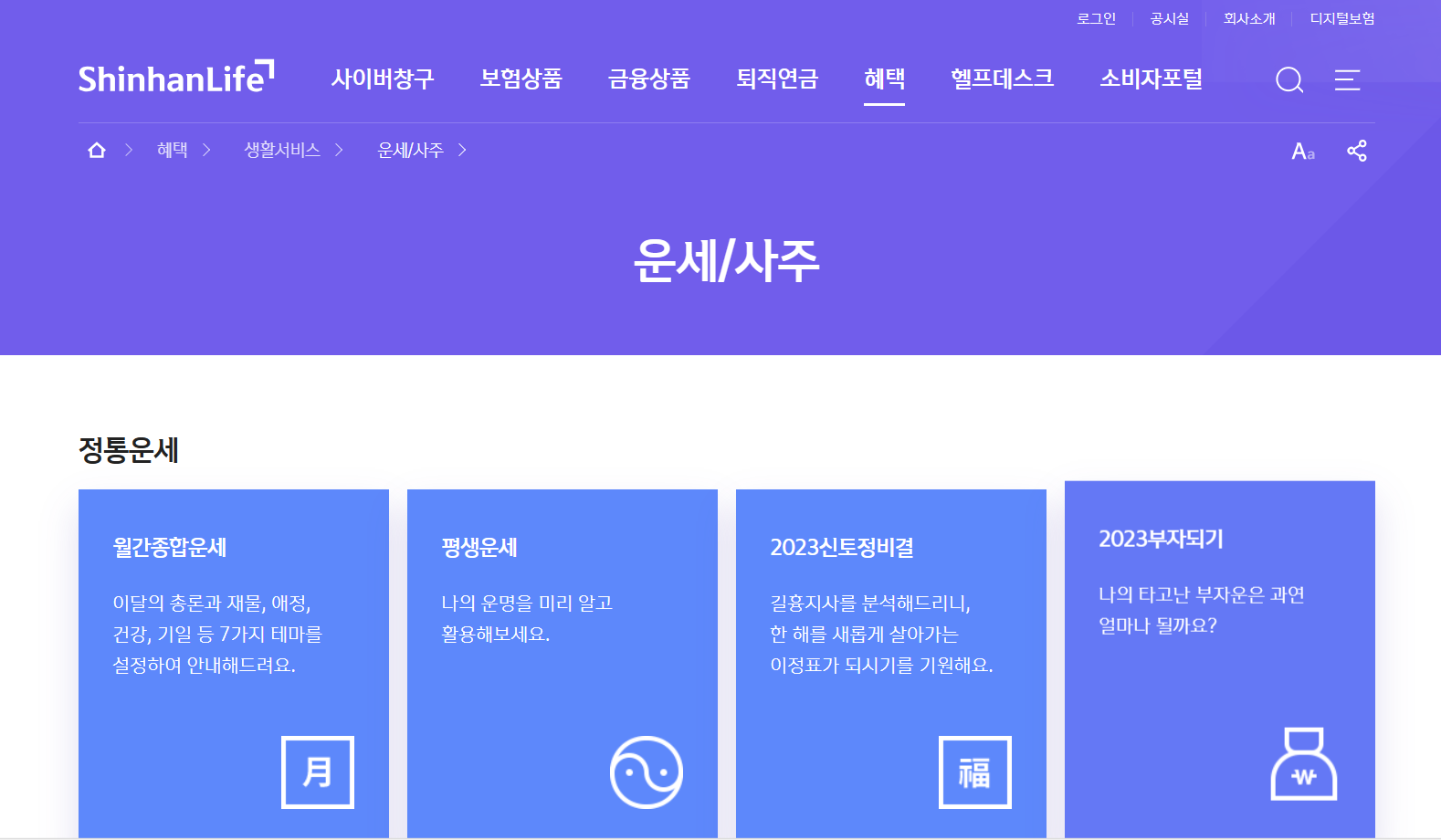 신한생명(신한라이프) 홈페이지에서 혜택> 생활서비스> 운세/사주 를 클릭하시면 신년운세 및 사주 등 여러가지의 운세를 볼 수 있습니다. 또한 현대적 의미로 재해석한 풀이를 제공한다고 합니다.