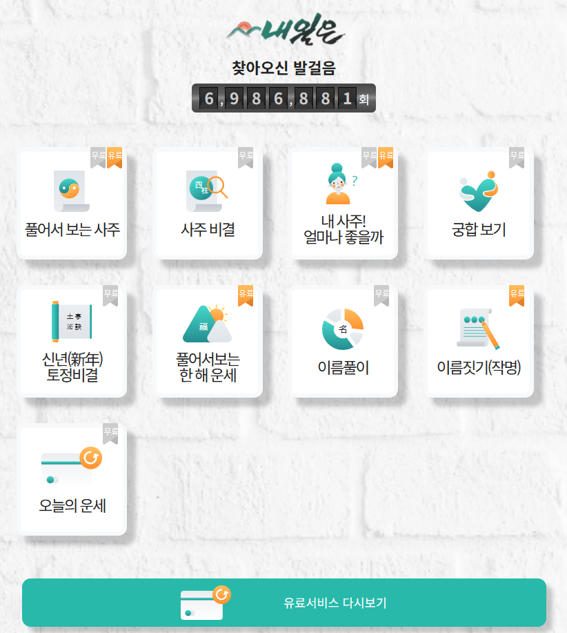 전통사주, 당 사주 등 다양한 종류의 사주를 무료로 볼 수 있는 사이트로 적중률이 높은 유명한 점집에서 운영하는 무료 사주 사이트입니다.